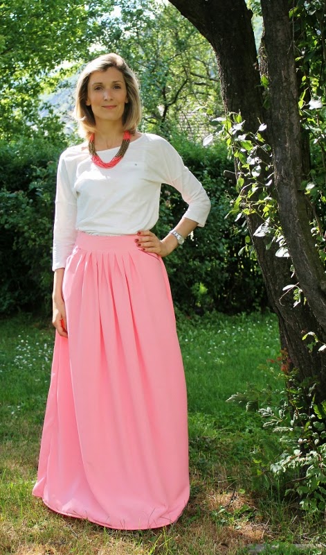 Comme d'habitude, j'adore! Je trouve souvent les maxi skirt un peu trop "vacances a la mer" mais le tienne est vraiment élégante. Je pourrais même m'imaginer aller travailler avec! Felicitations, elle est vraiment réussite et elle te va à ravir.